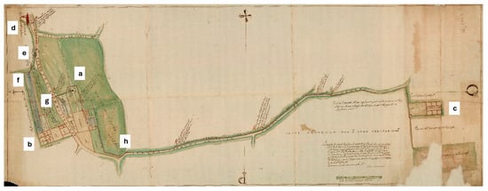 Drawing by Ercole Peretti from 1625 (A.S.VE. Beni Inculti—Verona, rot. 74, mazzo 64, dis. 5): a. Villa Giusti-Puttini; b. palace of Zenovello; c. Villa Giusti-Melloni in Vendri; d. Church of St. Mary; e. wash house of Santa Maria in Stelle; f. fishpond of Zenovello; g. park of palace of Zenovello; and h. water exit from the property of Vinciguerra di Sanbonifacio.