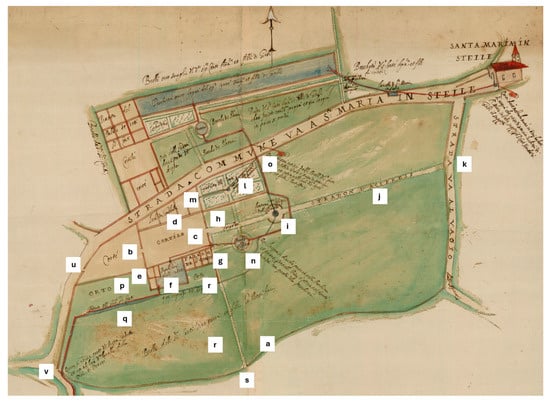 Detail of the 1625 drawing by Ercole Peretti (A.S.VE. Beni Inculti—Verona, rot. 74, mazzo 64, dis. 5) with the interpretation of the map made by the authors: a. brolo wall; b. courtyard; c. courtyard; d. foreman building; e. unnamed buildings; f. rectangular fishpond; g. manor house of the counts; h. pergola; i. fountain; j. cypress avenue; k. east road exit; l. garden with fountain and canals; m. water slope; n. circular fishpond; o. north water entrance; p. orchards; q. moat; r. brolo; s. south entrance; u. west entrance; and v. south-west entrance.