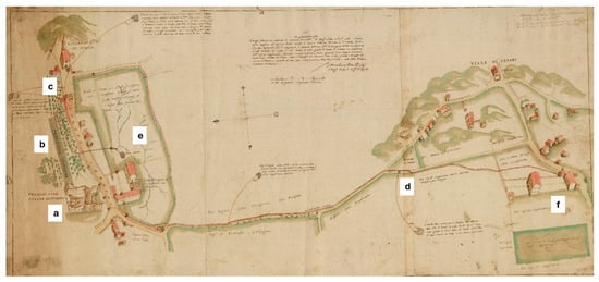 Drawing by Antonio Benoni dated 1683 (A.S.VE. Beni Inculti—Verona, rot. 102, deck 86, dis. 5): a. destroyed palace of Zenovello; b. destroyed fishpond; c. wash house of Santa Maria in Stelle; d. wash house of Vendri; e. Villa of Vinciguerra Sanbonifacio; and f. Villa of Nicolò Giusti.