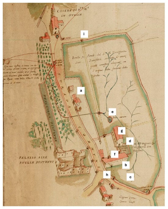 Detail of Antonio Benoni’s drawing of 1683 (A.S.VE. Beni Inculti—Verona, rot. 102, deck 86, dis. 5) with some interpretations by the authors: a. new buildings; b. courtyard building; c. no enclosure of the access court; d. ruined fishpond now orchard; e. ruined fishpond, called “dry hole”; f. pigeon tower; g. manor; h. access to the property from the main road; i. access to the property from the road behind to the east.