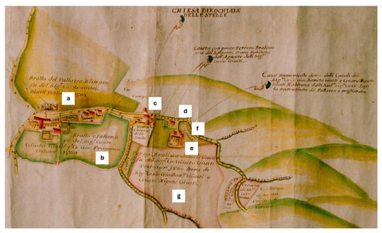 Detail of the drawing by Francesco Cornale, engineer of the city of Verona and public expert, in 1735 (A.S.VR, Archivio Campagna—B. 13, n. 154): a. palace of Count Zenovel Giusti: b. manor of Count Giusto Giusti then Giovanni Francesco Giusti; c. church; d. small house inhabited by the agent of the Counts Giusti; e. Casa dei Casali; f and g. lands of the Giusti family.