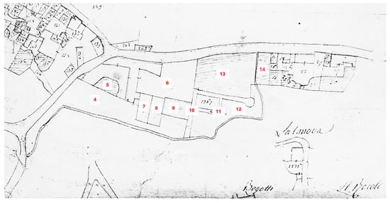 Napoleonic cadastre (coll. Catasto Nap.—Sommarione 403, A.S.Ve, 1817). The map refers to the numbers of the following descriptions: 4. meadow with fruit; 5. orchard; 6. foreman’s house with courtyard and oven; 7. wooded and sweet pasture; 8. wooded pasture; 9. house of own use; 10. path with meadow; 11. fishpond; 12. meadow with fruits; 13. orchard; and 14. orchard.