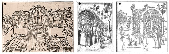 Another element described by Avogaro and present in historical maps is the pergola that, according to the 1735 drawing (Figure 10), covered the paths between the manor house, the garden, the fishpond and the fountain. The pergola must have existed because it is also drawn on the 1625 map, whereas it was not drawn on the 1683 and 1798 maps. As seen in De Crescenzi’s description, vine-covered pergolas were a common element of the late medieval and humanistic garden as can be seen in many of the garden illustrations of the time []. Among the illustrations, one drawing from De Agricultura [] stands out: (Figure 16a) is a view of a garden enclosed by a wall and the pergola and fountain can be seen in the background. Two other drawings are worth mentioning. The first (Figure 16b), reported by Marchi [], illustrates men of letters in the brolo of a Veronese villa: to the right of the pergola, the fishpond with two characters fishing reminds us of the spatial relationship between the pergola and the fishpond of Villa Giusti-Puttini. The last illustration (Figure 16c), from the publication Hypnerotomachia Poliphili by Francesco Colonna (1495), shows a pergola with a clear classical taste, with marble or wooden columns with classical forms and clearly wooden ribs for the transverse laths. This element is reminiscent of classical architecture and shows a clear humanist taste that initiates antiquarian culture []. Since this is the garden of Giusto Giusti, well known for his literary activity in the humanist environment of Verona, these two illustrations seem relevant as a reference for a possible pergola in the garden of his villa. Moreover, the depiction of the classical pergola reminds us of Avogaro’s description.