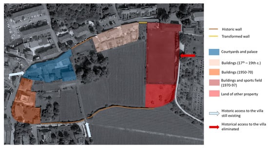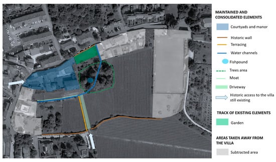 The study of the written documents has provided descriptions of the villa and the park (see Section 3.3), which have been fundamental to support the representations on the historical maps. On the other hand, the direct study carried out in situ has provided the material data on the current state of the villa. The comparison between the historical data and the current state has made it possible, on the one hand, to corroborate the veracity of the historical information and, on the other hand, to verify the permanence of the elements of the villa’s landscape up to the present day and to identify the traces of the elements that have partly disappeared.