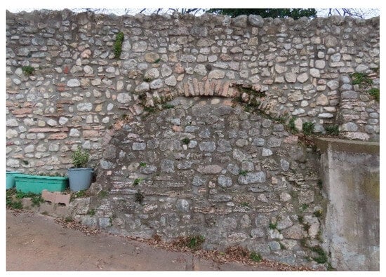 The built elements that characterise the park include the limits of the villa, the boundaries between its parts and some paths: the brolo wall (Figure 20), built with a masonry of limestone alternated with courses of flat red breccia; the path that joins the southern entrance and the manor, bordered by a terraced wall that saves the difference in height between the two parts of the brolo; and the wall that separates the main courtyard from the garden and the brolo that, despite later modifications, remains the constant boundary between the inhabited and cultivated parts of the villa. The wall of the brolo is lost to the west at the point where the football pitch is inserted, but it is precisely in the ramp that gives access to the football pitch that a section of the historic wall that closed the brolo to the east remains and possibly still preserves the hole of the ancient eastern access to the villa (Figure 21). Although this element materially remains, its total decontextualisation means that the east–west axis that characterised the brolo in the past has now been lost.