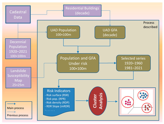 In accordance with the initial approach, this paper aims to analyse the situation and evolution of the population affected by the risk of landslides over time in relation to the population historically located in susceptible areas within the Valencian Community. The line of work followed is shown in the flow chart below (Figure 1).
