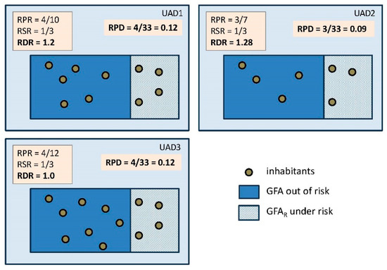 To illustrate this, Figure 2 shows an example with three different UADs covering a rectangular enclosure with a built-up area of 100 area units. Each circle represents a group of inhabitants (for the RPD calculation, 1 inhabitant). The three defined indices are calculated together with RPD under different scenarios: (a) change in population distribution; (b) change in number of affected inhabitants.