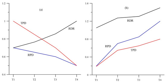 Figure 3 shows an example of two very different situations in which the RDR value increases. In Figure 3a, the UAD is affected by the phenomenon of depopulation with a loss of inhabitants, but in a more pronounced way in the whole area than in the risk area. In this case, the RDR’s trend is upward (positive mRDR) as the risk concentration decreases at a slower rate than the overall risk concentration. This is the case in Figure 2 with UAD2 and UAD3, and discussed above. The situation is improving since the RPD decreases, but the fact that the population at risk remains more stable than the overall population should be studied.