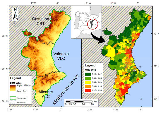 This territory, which is narrow and stretches along the Greenwich meridian, is located between the provinces of Tarragona to the north and Murcia to the south, bordered on the east by the Mediterranean. It comprises the provinces of Castellón (CST), Valencia (VLC), and Alicante (ALC), which make up a total of 542 municipalities or equivalent UADs in Spain. It is organised into three well-defined units, namely the coastal strip, the intermediate strip, and the mountainous interior. The latter is where landslide events occur most frequently and it suffers from a more constant and marked rural exodus. The coastal strip, which in Alicante and Castellón also has coastal mountain ranges, is where the population and recognised tourist destinations are mainly located.