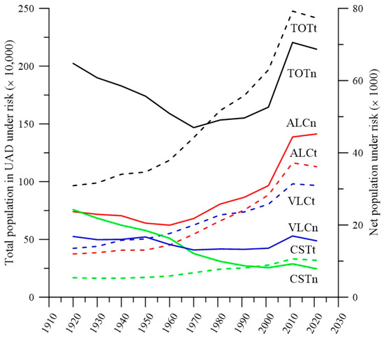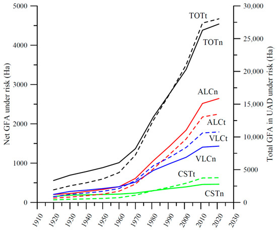 Residential building evolution for UADs under risk (t) and net directly affected (n), in ALC (Alicante), CST (Castellón), and VLC (Valencia).