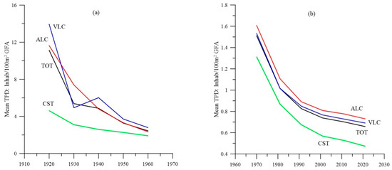 Mean value TPD in UADs under risk. Historical 1920–1960 (a) and recent after 1970 (b) periods.