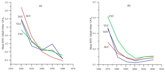 Mean value for population density under risk RPD. Historical 1920–1960 (a) and recent after 1970 (b) periods.