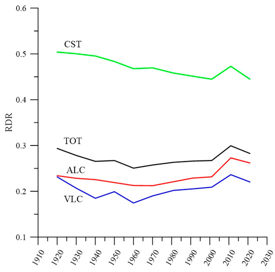 As the RDR is defined, if for a given period of time and in the same area this index increases along with the population, this can only be because there is an increase in the population at risk being affected greater than what is experienced by the overall population. Conversely, population density can also decrease, as is the case with depopulation in small municipalities located in poorly connected mountain valleys. In this case, if the decline is more pronounced in total population density than in risk concentration, the RDR value will increase. This situation is unusual, as normally in a municipality suffering from depopulation the population density and the population affected by risk is usually similar, especially if the municipality has a large area at risk (high RSR).