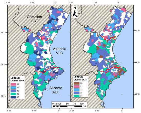 Figure 12 shows two maps with the geolocation by municipality of all the clusters in the two periods. The concentration of cluster 20 along the coast of Alicante should be noted. This is the La Marina region, an area that has already been studied by the same authors [57] and whose results do not differ from those presented in this paper. This study, please note, was carried out by considering only the evolution of the risk assessed in economic units, without including in any way the population affected.