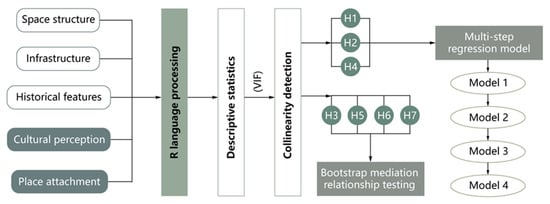 This study analyzed the impact of different variables on the well-being of historical urban parks through a multistep regression method. Conducting multistep regression according to different categories was conducive to clearly determining the direct correlation between each category and well-being. In Model 1, four demographic variables were first introduced: gender, age group, educational background, and occupation. In Model 2, seven physical characteristic variables related to parks were further introduced, including park area, green space shape index, and green coverage rate, among others. Model 3 incorporated cultural perception and place attachment factors to analyze their association with well-being. In Model 4, we not only included basic demographic variables, park feature variables, and perception variables, but also introduced several interaction variables to further explore the impact of the interactions between these variables on well-being, making the correlation analysis more scientific.