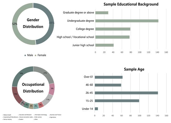 Figure 4 presents the demographic information of the study sample. Among the participants, the distribution of males and females was relatively similar, with males accounting for 48% and females accounting for 52%. Regarding age distribution, young adults and middle-aged people (i.e., aged 26–45) accounted for the largest proportion, followed by young people aged 15–25. Meanwhile, participants were generally relatively well educated, with more than half having attained an undergraduate degree or higher. Regarding occupational distribution, the healthcare industry and other industries (or retirees) accounted for the largest proportion.