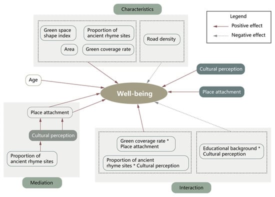 In Model 4, we introduced four sets of interaction variables to further explore the impact of interactions between different variables on the well-being of visitors to historical urban parks. Among them, regarding the proportion of ancient building area * cultural perception (β = 5.018, p = 0.011, not mixed), green coverage rate * place attachment (β = 0.404, p = 0.034, not mixed), the two interaction variables were found to have a significant positive impact on well-being. Meanwhile, educational background * cultural perception (β = −0.068, p = 0.017, not mixed) was significantly negatively correlated with well-being.