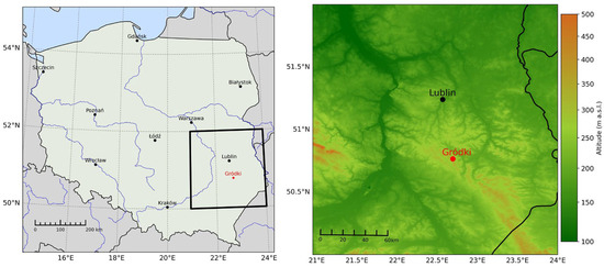 Hypsometric map of Gródki area. Source: https://www.labgis.pl/hipso/#12/50.7382/22.7870 (accessed on 25 May 2025).