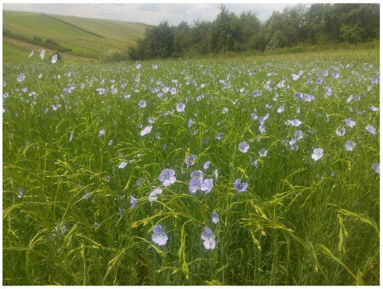 In autumn, cultivation was limited to post-harvest treatments, aimed at destroying weeds, and deep pre-winter ploughing to a depth of 20–30 cm. In autumn, before winter ploughing, phosphorus–potassium fertilization was applied in accordance with the soil’s nutrient content. The following amounts of fertilizers were applied: 54.6 kg P ha−1, in the form of triple superphosphate 48%, and 124.5 kg K ha−1, in the form of potassium salt 60%, mixed with the soil. In spring, to limit water evaporation, harrowing was carried out with a light harrow. The next treatment was soil fertilization with nitrogen in the amount of 30 kg N ha−1 and in the form of ammonium nitrate. Fertilization in this experiment was based on soil test results and recommendations for flax cultivation. Then, using a cultivation-sowing unit, sowing was carried out in the amount of 130 kg ha−1 to a depth of approx. 2 cm, which ensured a density of 2300 plants ha−1. Before sowing, flaxseeds were dressed against seedling blight and flax anthracnose with Oxafun T 75 DS/WS seed dressing, in the amount of 3 g·15 mL H2O. Sowing was carried out on 18 April. To ensure the proper development of flax, protection against pests, diseases, and weeds was applied; in the experiment, care was taken to ensure proper plant protection management, and the above-mentioned agents were used. In the period from emergence to 5 cm of flax height, when the first flax long-legged beetles and flax flea beetles appeared, in the number of 5–10 pcs·m−2, the plants were sprayed with Karate Zeon 050 CS in the amount of 0.15 dm·ha−1. The treatment was repeated after 10 days. At the turn of May and June, when the first thrips appeared (harm threshold: 2 individuals on 10 plants), Karate Zeon 050 CS preparation was applied at a dose of 0.15 dm ha−1 [56,57]. This treatment was repeated after 15 days. A very important agrotechnical treatment was the regulation of weed infestation in the canopy. The herbicide Glean 75 WG 15 g ha−1 was used against dicotyledonous weeds in the cotyledon stage to the 2-leaf stage (at the latest, in the herringbone stage). The herbicide Targa Super 05 EC was used against monocotyledonous weeds one week after the application of the agent against dicotyledonous weeds, at a dose of 1.5 dm ha−1 [56,57,58].