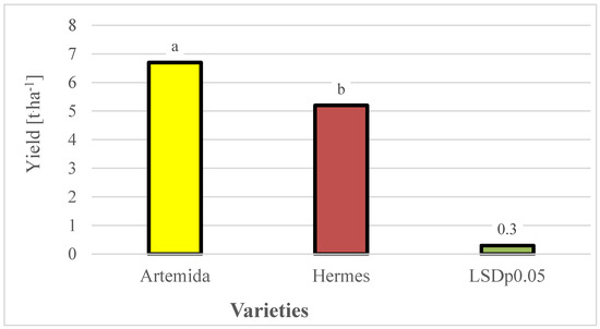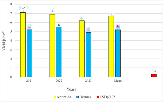 K2O (potassium) levels were high in 2021 (22.0 mg), and then stabilized at an average level in 2022 (15.5 mg) and 2023 (16.0 mg). Mg (magnesium) content increased from low (4.5 mg/100 g d.m.) in 2021, through average (5.4 mg/100 g d.m.) in 2022, to very high (10.8 mg/100 g d.m.) in 2023, which is beneficial for improving soil quality [66,67]. In summary, the decrease in acidity and the increase in the availability of phosphorus and magnesium in 2023 indicate a significant improvement in soil conditions. The year 2023 turned out to be the most favorable for plant cultivation, providing better growth conditions compared with previous years [65,66].