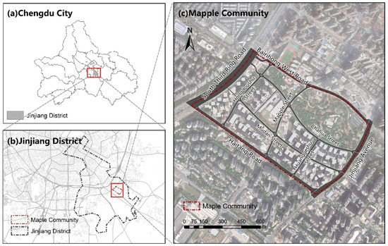 The study area, Maple Community, is located in the Chenglong Road Subdistrict of Jinjiang District, Chengdu City. It comprises seven residential complexes, including Sihai Yijia, Xinyuan Mingjia, and Jinjiang Yijia (Figure 1). Constructed between 2011 and 2015, the community covers an area of approximately 73 hectares, with a total of 14,293 households and a population of 33,000. Among the residents, 66% are middle-aged and young adults, while 34% fall into the “elderly and children” category.
