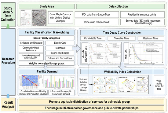 Evaluating the walkability of embedded community service facilities is crucial for fostering age-friendly neighborhoods. Existing studies predominantly focus on qualitative analyses of single age groups, lacking a quantitative framework that integrates multigenerational demands and dynamically combines accessibility with facility usability. This study proposes a novel age-differentiated walkability evaluation framework through a case study of the Maple Community in Chengdu, China. The framework innovatively integrates facility classification weighting systems, population-specific distance decay functions, and multisource spatial data analysis to reveal intergenerational disparities in facility demand and spatial suitability. Key contributions include the following: (1) developing mobility-attenuated accessibility models tailored to distinct age groups, overcoming the limitations of traditional single-function approaches; (2) establishing a multidimensional evaluation system that bridges accessibility theory and usability metrics; (3) empirically demonstrating the spatial equity improvements through embedded facility optimization. The results highlight that elderly residents prioritize healthcare facilities (weight = 0.22), while adolescents rely heavily on cultural–recreational amenities (weight = 0.32). Post-renewal walkability scores in core areas increased by 52.3%, yet persistent peripheral disparities underscore intergenerational accessibility gaps. The framework provides theoretical and methodological advancements for age-friendly community planning, offering actionable insights for data-driven urban renewal policies.