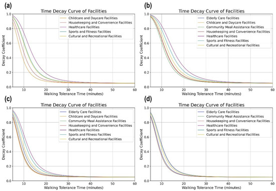 Time decay curve of facilities: (a) adolescents, (b) young adults, (c) middle-aged adults, (d) elderly.