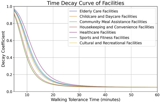 The calculated walking time () was then input into the previously established time decay function to derive the decay coefficient () for each facility [46]. This coefficient reflects the diminishing likelihood of residents accessing a facility as walking time increases. Subsequently, the decay coefficient () was multiplied by the facility weight ()—as determined in the formula below—to compute the walkability index () for each facility.