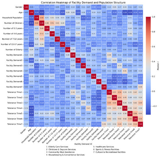 This study reveals the characteristics and differences in the demand for various embedded service facilities across different age groups in age-friendly communities through an analysis of the relationship between population structure and facility requirements. According to the data analysis from Figure 6, family size shows a significant positive correlation with the number of children (r = 0.60), particularly in the age groups of 0–3 years (r = 0.48), 4–6 years (r = 0.51), 7–12 years (r = 0.43), and 13–17 years (r = 0.34). This indicates that areas with larger family sizes, especially those with more children, exhibit a stronger demand for child-related facilities, such as daycare centers and early education facilities. As family size increases, particularly in households with more children, the demand for daycare services and early education facilities becomes more pronounced. The data from the chart clearly shows that family size and the number of children have a significant impact on the demand for these facilities, emphasizing the need to prioritize the provision of childcare and early education facilities in areas with high child population density in age-friendly community planning.