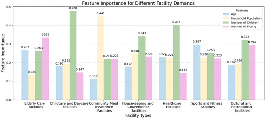 From an age-friendly perspective, these data highlight the differing needs of various age groups and provide a reference for community planning based on the characteristics of these needs. Particularly for children, priority should be given to increasing daycare and daytime care facilities to meet the needs of households with a larger number of children. For the elderly, elderly care and medical facilities should become the focus of community planning, especially in areas with a high elderly population, where planning should prioritize the accessibility of these facilities.