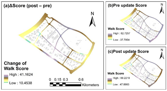 (a) Post-update Walk Score–pre-update Walk Score; (b) pre-update Walk Score; (c) post-Uupdate Walk Score.