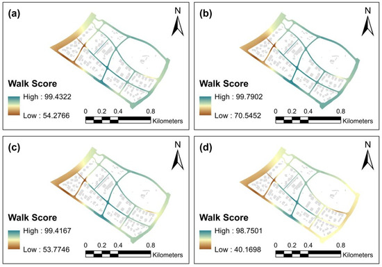 Accessibility map of embedded service facilities: (a) walkability index for adolescents, (b) walkability index for young adults, (c) walkability index for middle-aged adults, (d) walkability index for the elderly.
