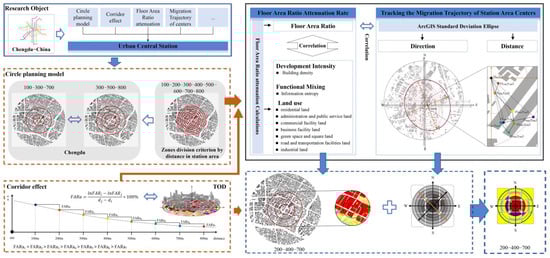 Overall, this study adopts a dual-dimensional framework comprising “zoning planning + station center migration”. The specific research ideas include: (1) Analyzing the August to September 2024 development characteristics of central TOD station spaces using corridor effect analyses and regional center offsets; (2) Taking the city’s local TOD guidelines as the starting point to redefine TOD station space zoning planning; (3) To explore the regional attenuation rules and changes in the target site based on the TOD station space development model and the aggregation effect, the FARa is used as a dominant factor in circle attenuation; (4) Reflect the FAR under different zone schemes based on Pearson correlation coefficient, analyze the relationship between FARa and other spatial indicators associated with TOD stations. Also, examine the multi-level influences on central station area zoning planning. Meanwhile, applying standard deviation ellipses and ArcGIS, the development trajectory of the zone development center is determined based on the evolution of the FARa in each 100 m zone; (5) Based on the obtained quantitative results, the zoning planning principles and regional center offset rules suitable for the central TOD station space are evaluated, and subsequent construction opinions and references are provided for the development of the surrounding environment of such stations. This is the procedure for the research (Figure 1):