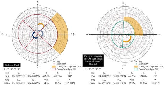 An example of zone development center offset, which takes the 800 m zone from Yushuang Road Station and the 500 m zone from Chengdu University of TCM and Sichuan Provincial People’s Hospital Station as examples.