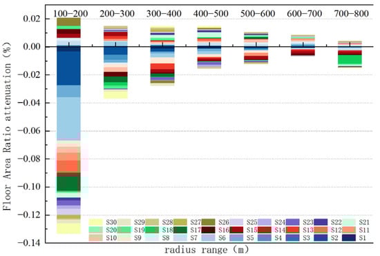 A comparison of the correlation results with the development center of each circle reveals the degree to which the development center’s directional shift influences FAR (Table 5). They are negatively correlated only in the 200 m and 800 m circles. FAR within the 100 m circle and  at 200 m show a significant negative correlation (−0.556***). There is a negative correlation among many circles at 800 m, ranging from 400–800 m. A further finding was that FAR decreased gradually with the strengthening of the development direction and a weakening of the central concentration. The data shows that the  of the central station reaches the maximum value (76.22 m) at 800 m, demonstrating the strongest directionality and weakest central aggregation force. As a result, this circle has the greatest impact on FAR.