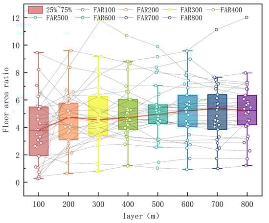 Figure 5 illustrates the FAR distribution of different stations in different zones. Furthermore, it shows that the FAR continues to increase as the scale of the station domain expands to the 700 m circle. It is evident that the FAR value of the same site changes significantly between 100 and 700 m, which is indicative of the fact that FAR is an important guiding factor to TOD zoning planning.