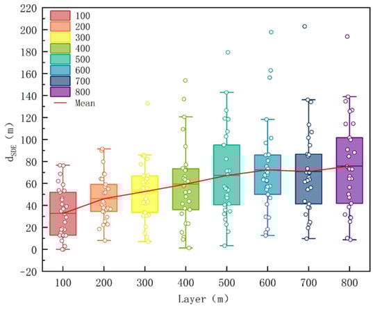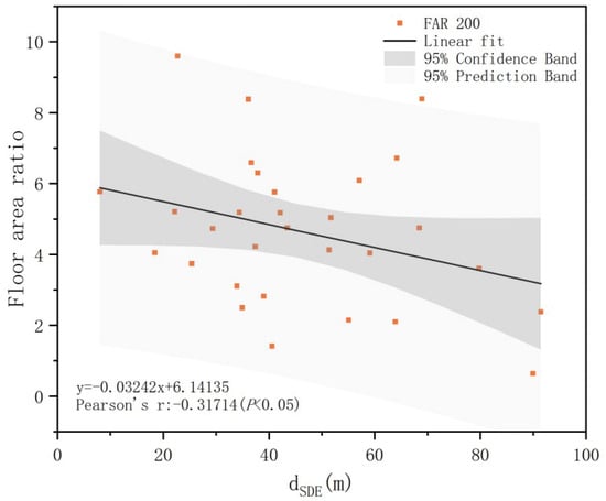 The correlation analysis of the distance between the development centers and the sites in different zones and the FAR indicates that as the station domain gradually expands, the changes in the FAR are directly related to the shift in the development center into the radiation area (Table 4). With the expansion of the station area, the development center shifts outward but is primarily located within the 0–100 m core zone (Figure 6). A negative correlation has been observed between dSDE and FAR only within the 200 m zone, and the center offset of this circle also exhibits a negative correlation with FAR at 100 m, 700 m, and 800 m (Table 4). Based on the linear fitting of dSDE and FAR for the 200 m zone layer (Figure 7), the FAR gradually decreases with shifts in the development center of the zone.