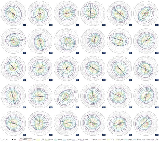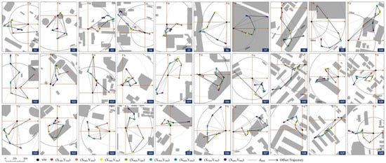 Although the development centers of each zone are primarily located within the 0–100 m radius of the station, their offset trajectory (OT) and distribution orientation vary significantly. Figure 8 illustrates a coordinate system with the station at its center. Currently, central stations are primarily located in the southwest and northeast areas of various zones. According to Figure 6, the nearest development center located within a 100 m circle is the center of the ellipse, and the furthest is 700 m away. Zones do not, however, affect the position of development centers and stations within a single station. For instance, in the S22 station domain, the distance from the center of the 800 m ellipse to the station is 10.2 m, while the average distance from other zones is 38.31 m. Several development centers and stations in different zones may have different development directions, even though their distances are the same. Similarly, in the S11 station domain, the development centers between the 400 m and 500 m zones are approximately 25 m away from the station, but are in the southwest and northwest, respectively. Nearest to the 200 m circle are the four stations’ space like S4, S9, S27, and S30, which are the development centers of the 600–700 m zone. Additionally, the offset trajectories of the elliptical centers of the four stations are a single line, and there is no intersection or overlap between them.