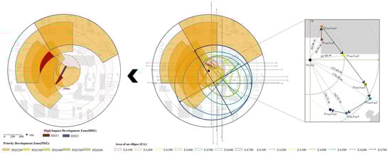 Furthermore, the development centers () of different zones, as determined by the SDE principle, serve as the central gathering points for the architectural elements within each zone. Following clarification of the offset direction, location, and EA range of the zone development center relative to the site, we found that the offset  direction, the  distribution range, and the specific offset angle conflict with the initial coordinates of the site. Consequently, this area is designated as a priority development zone (PDZ). It is also possible to use this method to determine whether the existing TOD central station area is overdeveloped or underdeveloped. For this reason, ArcGIS is used to visualize the distribution positions between the two. It is established that the coordinate system will be based on the  and  of the zone development center EA. The PDZ is determined based on the quadrant range of the coordinate system where the site is located minus the EA (Figure 3).