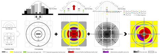 - According to the optimization of land structure elements, high-density commercial service facilities will be concentrated within a radius of 0–200 m; medium-density development will occupy a radius of 200–400 m, and an appropriate amount of public management and public service land, green space and squares, roads, and transportation facilities will be developed. Within this range, improvements in accessibility, functional mix, and ecological construction of station space are essential optimization methods. In general, 400–700 m should be developed in a low-density mode, primarily for residential use, in accordance with current TOD zoning planning principles, as well as reducing the attenuation rate of the floor area ratio in a direct manner. In addition, green space and road land should be added to the station area within 500–700 m to mitigate the negative impact of changes in spatial density inside and outside the station.