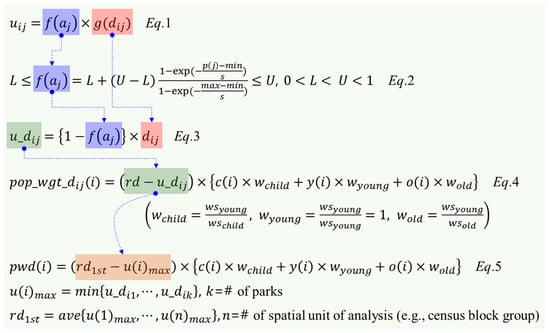 Because the population distribution (i.e., demand side) is fixed, the maximum utility occurs at the park where —the adjusted travel distance—is minimized. Reflecting this, Equation (4) can be reformulated into Equation (5), which defines , or the population-weighted distance for unit , based on the park providing the minimum adjusted distance.