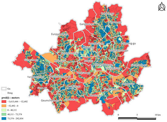 Figure 3 presents the spatial distribution of values visualized as a choropleth map, classified using a quantile-based interval scheme. In Figure 3, darker red tones indicate census block groups where values increase in the negative direction. A negative value of occurs when is negative. When this difference is multiplied by the population—adjusted by age-specific walking speed weights—the resulting value becomes larger in the negative direction. This implies that residents in those areas must travel farther than the citywide average to access the park that provides the highest utility. Moreover, if the weighted population is large, it means a greater number of people must travel relatively longer distances, which corresponds to lower overall utility in those areas. Conversely, darker blue tones indicate areas where the highest-utility park is located closer than the average reference distance. In such areas, the greater the population, the more substantial the resulting utility. Thus, regions shaded in red in Figure 3 indicate areas where targeted policy interventions may be needed to enhance park accessibility and utility. The results in Figure 3 reveal that such low-utility areas are widely distributed throughout the city but are particularly concentrated in the outer districts of Seoul. These peripheral regions are largely mountainous, which may constrain the development of formal neighborhood parks within a 10 min walking distance. While these areas may contain natural green spaces such as forests or trails, such spaces may not provide the same level of accessibility or functionality—particularly for older adults or families with children—as designated neighborhood parks. However, some red-shaded areas also appear in the urban core, indicating that efforts to improve park utility are needed even within central districts of the city.