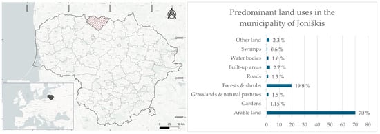 Geographical location of study area (left (striped area)) and percentage of predominant land uses in the municipality of Joniškis (right). Source: authors based on [52].