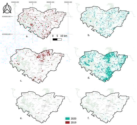 Identified carbon practices from satellite images (grey polygons). (a) cover crops in 2019, (b) cover crops in 2020, (c) no-till parcels in 2019, (d) no-till parcels in 2020, (e) residues in 2019 and (f) residues in 2020. (Source: authors).