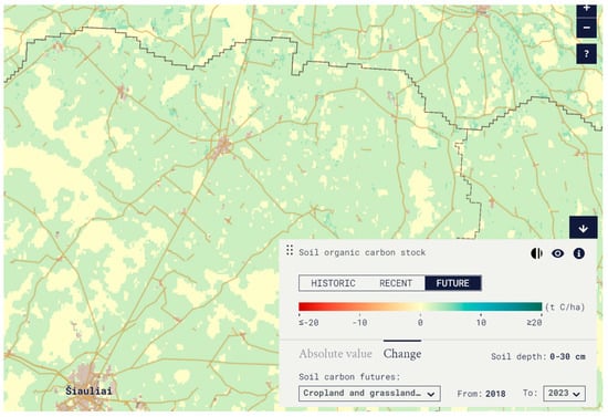 Soil data such as SOC stocks, clay content, and modern data were retrieved from the ESDAC database [53]. These rasters were originally in varying coordinate systems and spatial resolutions (1 km for SOC, 500 m for clay and modern). All layers were reprojected to the WGS84 (EPSG:4326) coordinate system, clipped to the boundaries of the Joniškis municipality, and resampled to a common 500 × 500 m grid using nearest-neighbor interpolation as appropriate.