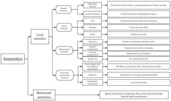 In this paper, amenities are categorized into local amenities and borrowed amenities. Local amenities are further divided into four aspects: natural amenities, leisure amenities, infrastructure amenities, and social and cultural amenities (Figure 1). According to the center-periphery model [32], the varying usage frequencies of facilities at different hierarchical levels lead to spatial segregation between high-frequency daily facilities and low-frequency high-tier facilities. Consequently, at both urban and regional scales, we observe high-rent central zones characterized by a concentration of high-grade amenities, alongside low-rent peripheral areas dominated by daily necessities, green spaces, and low-density leisure venues. These two types of regions exhibit complementary amenities distributions, interconnected through transportation networks. Thus, in the process of location decision-making, talents consider not only the amenities of their immediate residential environment but also evaluate the combined accessibility of amenities across multiple regions at an expanded spatial scale. This phenomenon has been further reinforced by declining transportation costs [33]. Within regional integration and metropolitan development frameworks, cross-city amenities borrowing has become increasingly prevalent. Recent studies in spatial economics have noted that isolated urban studies in regional migration models have resulted in significant errors [34]. Consequently, scholars have shifted their attention from the urban scale to the regional scale in urban studies, proposing concepts such as “borrowed size” [35]. Unfortunately, this widespread and significant perspective has been neglected in the research on talent location and urban amenities. To address this gap, this paper introduces the concept of borrowed amenities to depict the complementarity in specific aspects of amenities between adjacent cities, which is different from central place theory, emphasizing the grade and coverage of facilities; for example, Beijing’s borrowing of green spaces from surrounding cities is not caused by differences in coverage and grade.