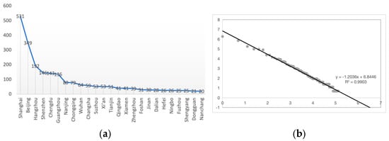 The rank-size rule is used to describe the degree of micro-celebrities’ agglomeration within a city. Zipf’s law, a classic application of the rank-size rule, states that the size of a feature in a city multiplied by its rank order is equal to the size of the first city [59]. A more general model includes adding a power index to the rank variable as an elastic coefficient, thereby enhancing the universality of the rank-size rule.