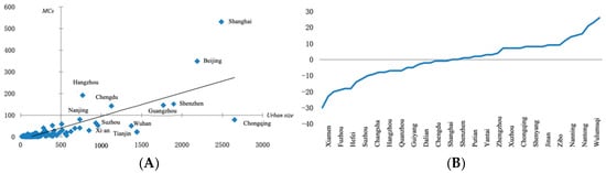 The characteristics of cities where micro-celebrities gather. (A) The horizontal axis represents the size of the city, and the vertical axis represents the number of micro-celebrities. Cities above the trend line show stronger attractiveness for micro-celebrities than those below the trend line. (B) Represents the difference between the order of population size and the order of micro-celebrities. Cities located below the coordinate axes indicate that the concentration degree of micro-celebrities is greater than that of the population.