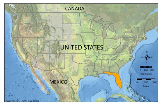 This project encompassed all 67 counties in the state of Florida, United States (Figure 1). The state is ecologically diverse and includes both sub-tropical and tropical climates, with a wide range of natural communities including upland forests, dry and wet prairies, swamps, and freshwater marshes among many others. The state is primarily flat with the northern portions reaching 100 m above sea level while elevations in the southern part of the state are rarely over 30 m [15]. Areas such as the Big Bend of Florida are low and flat, with this shallow gradient extending into the Gulf. These areas are already being affected by changes in sea levels [16].