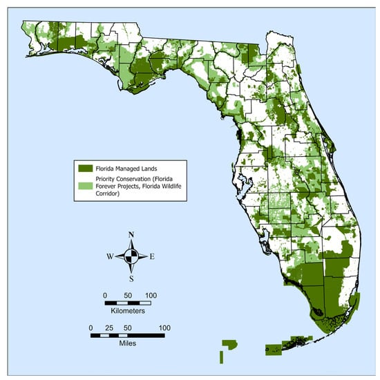 - Florida Forever | Florida Department of Environmental Protection. Available online: https://floridadep.gov/lands/environmental-services/content/florida-forever (accessed on 13 May 2025).